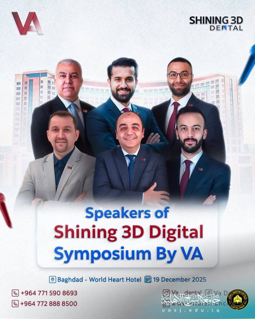 بدعوةٍ كريمة من إحدى كبرى الشركات العالمية الرائدة في مجال طب الأسنان، Vital Alliance، وبحضور محاضرين دوليين متخصصين، شاركت كلية طب الأسنان في جامعة السراج، متمثّلةً بمعاون عميد الكلية وعدد من طلبتها، في فعاليات SHINING 3D DIGITAL SYMPOSIUM BY VA، والذي يُعد الأول من نوعه في العاصمة بغداد.